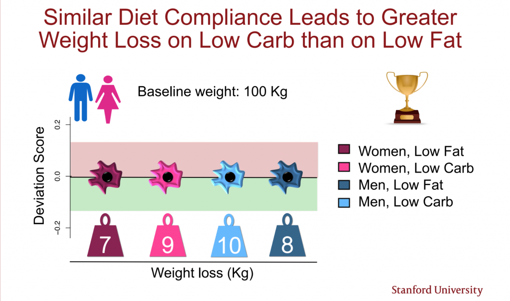 A perda média de peso ao longo de um ano para os grupos (composta por homens e mulheres) foi de 11,7 libras (5,3 kg) pelos do grupo com baixo teor de gordura e 13,2 libras (6,0 kg) pelos do grupo com baixo teor de carboidratos. (A perda de peso foi mais baixa no grupo low-carb, mas não era uma diferença estatisticamente significativa.) Assim, surgiu o artigo do New York Times citado acima.