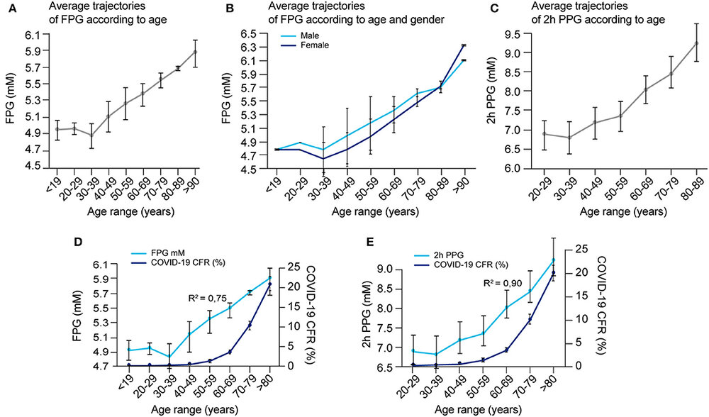 Concentrações de glicose no sangue de acordo com idade e sexo e correlação com fatalidade de COVID-19.