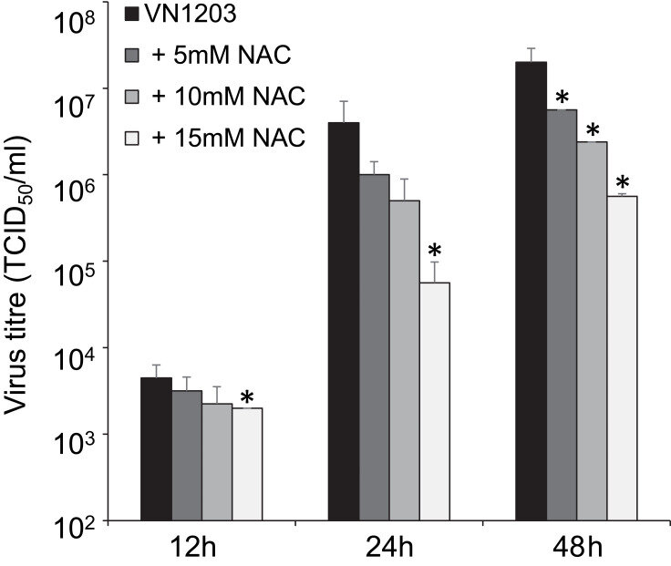 A influência do NAC na replicação do vírus H5N1. Quanto maior a dose de NAC administrada, menor a replicação viral.