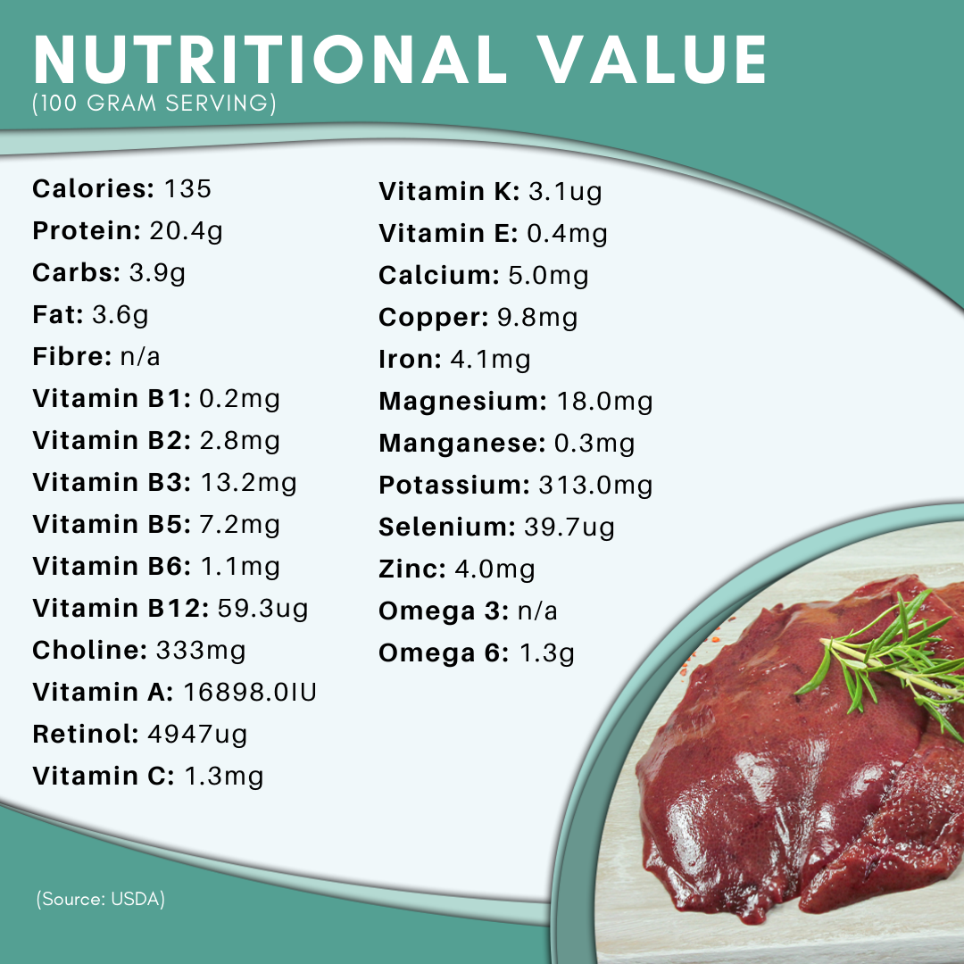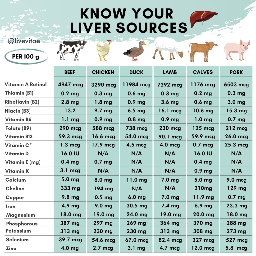 Temos valores elevados em todas as vitaminas B (B1, B2, B3, B5, B6, B7, B9, B12), temos a verdadeira forma da vitamina A, o retinol. além disso, temos cobre, ferro, colina, vitamina K2, manganês, selênio, zinco e até magnésio. Os nutrientes restantes estão em quantidades menores, mas ainda têm valor, mesmo a vitamina C, surpreendentemente, encontrada no fígado. Assim, o fígado (100 gramas por dia) pode cobrir até 50% da dose diária recomendada (DDR) de ferro, zinco, selênio, vitaminas B12, B1, B2, B6 e 100% da vitamina A.